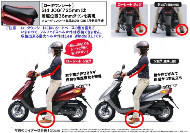 エントリーモデルのYAMAHA JOGにローシート仕様が発売されます 通常のシート高が725mmでこのローシート仕様は-36mmダウンです