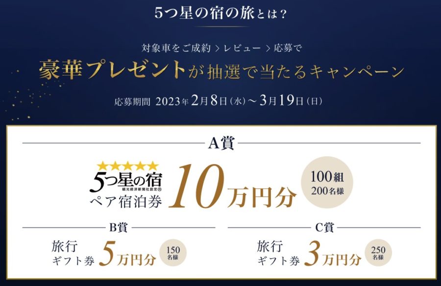 A賞:5つ星の宿 ペア宿泊券10万円分:抽選100組 200名様